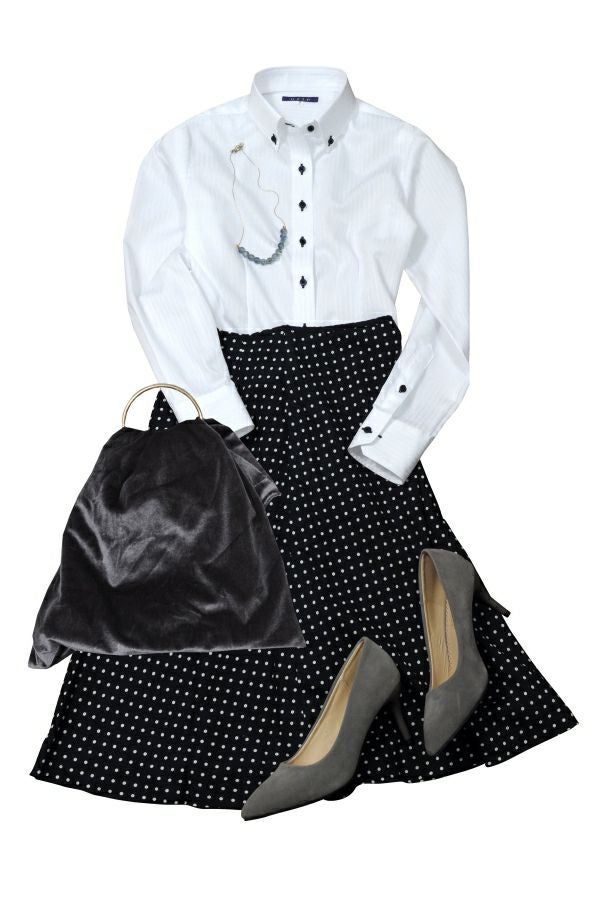 シンプルな白シャツに、ネイビーのボタンがピリッとしたアクセント。