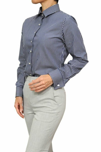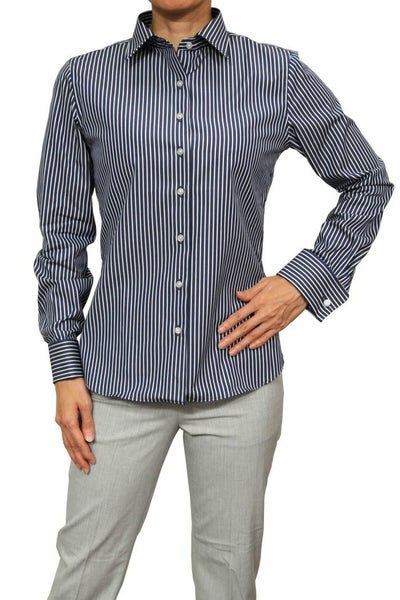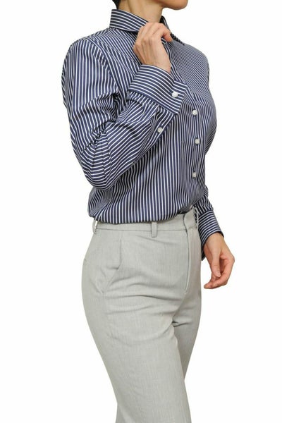 メリハリのある中に知的で落着きのある、甘くない大人スタイルのストライプ柄レディースシャツ。