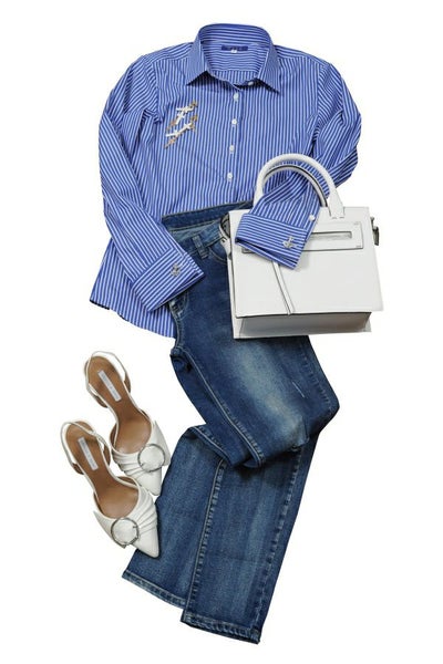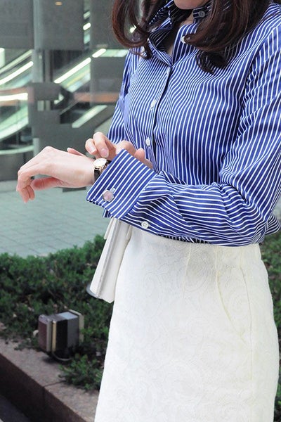 カフスボタンをして袖元を華やかに彩るメンズライクなレディースシャツ!