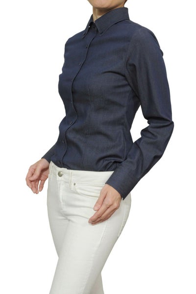 カジュアルな印象の強いデニム色ですが、メンズ仕立ての芯のある衿とカフスがきちんと感のあるカジュアルに。またスリムなスタイルが上品な雰囲気になります。