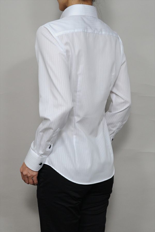 通常のボタン留プラス、カフスボタンも使えるコンバーチブルカフス。レディースシャツでも、袖元はすっきりしたまま、ダブルカフスのようにカフスボタンの上品なアクセントとオシャレを楽しむことが出来ます。