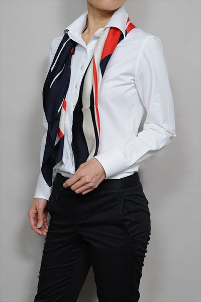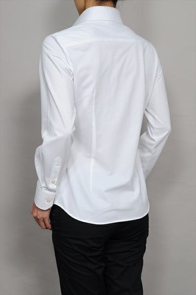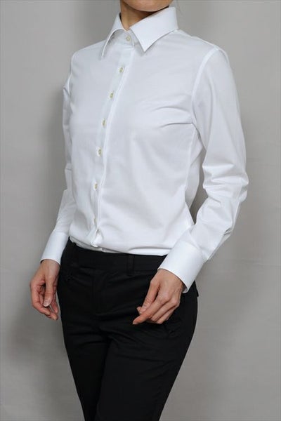 レディースシャツでも、袖元はすっきりしたまま、ダブルカフスのようにカフスボタンの上品なアクセントとオシャレを楽しむことが出来ます。