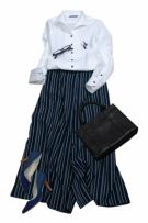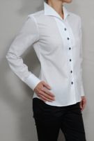 上品な光沢を放つ白生地に、ネイビーのボタンで知的な印象をプラス
