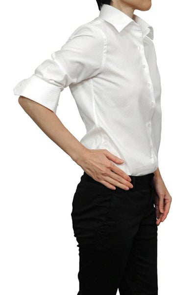 レディースシャツでも、カフスボタンの上品なアクセントとオシャレを楽しむことが出来ます。