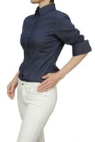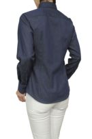 カジュアルな印象の強いデニム色ですが、メンズ仕立ての芯のある衿とカフスがきちんと感のあるカジュアルに。またスリムなスタイルが上品な雰囲気になります。