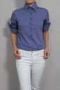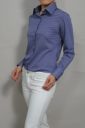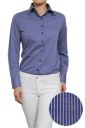 ブルーのストライプ柄にネイビーボタンがポイント。