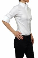 ボタンダウンとスリムなスタイルが、シャープな印象のレディースシャツです。