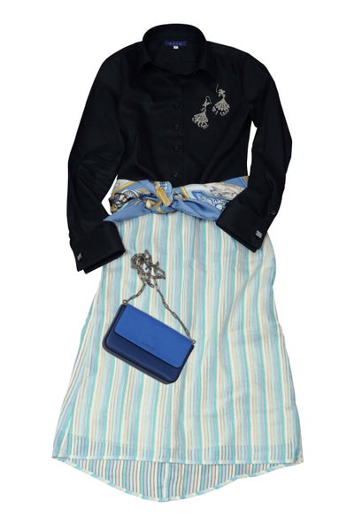 全体を引き締めてスレンダーにみせてくれる黒シャツ。