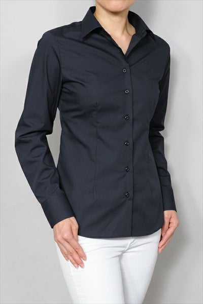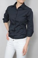 シンプル&ベーシックのスリムなスタイルに小ぶりな衿のワイドカラーレディースシャツ。