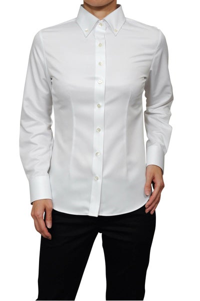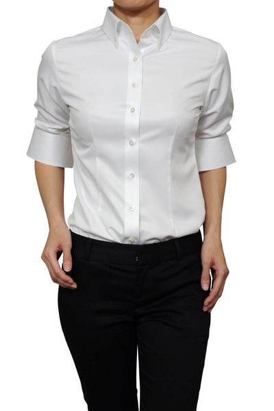 ボタンダウンとスリムなスタイルが、シャープな印象のレディースシャツです。