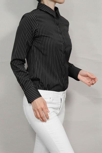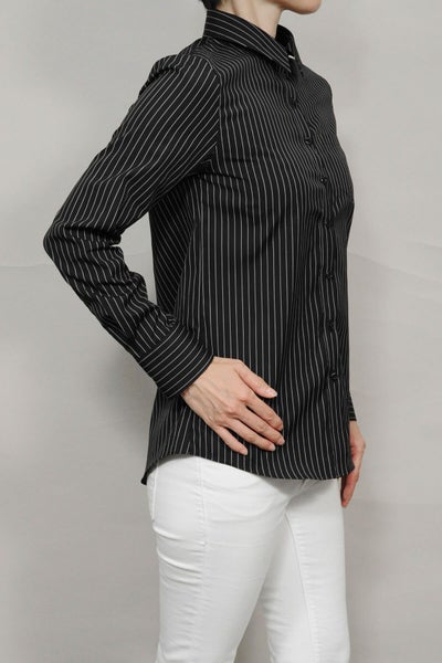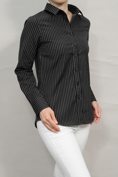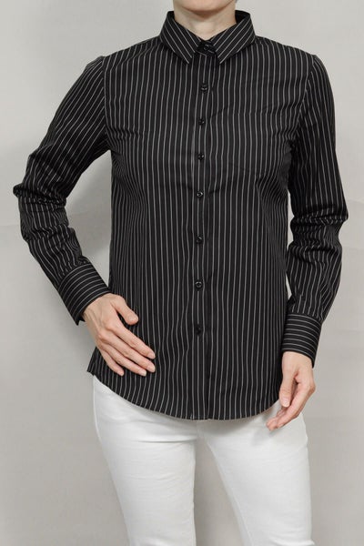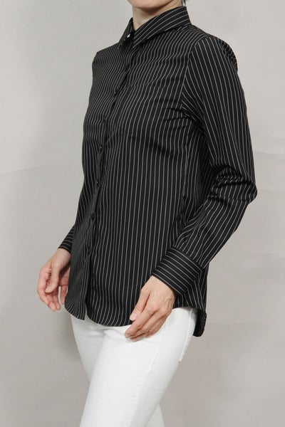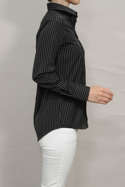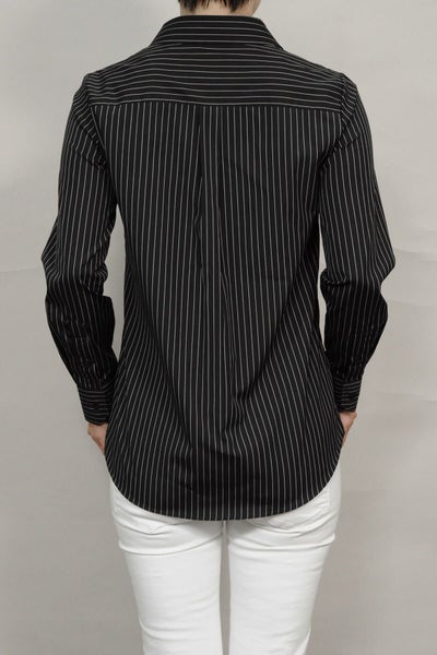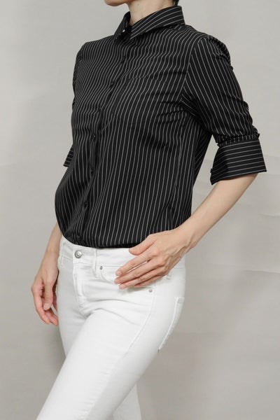 ピンストライプの黒シャツがマニッシュな雰囲気!