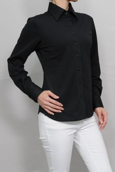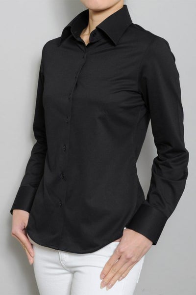 レディースシャツでも、袖元はすっきりしたまま、ダブルカフスのようにカフスボタンの上品なアクセントとオシャレを楽しむことが出来ます。