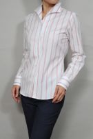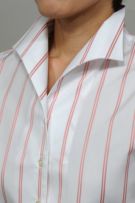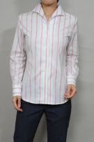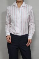 イタリアンカラーの曲線とストライプの直線がマッチしたシンプルなレディースシャツです。