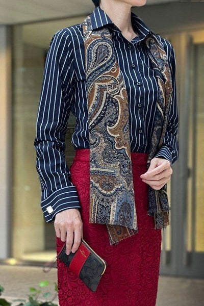 袖元が華やかなだけにシャツだけで十分な見栄えの着こなしになります。