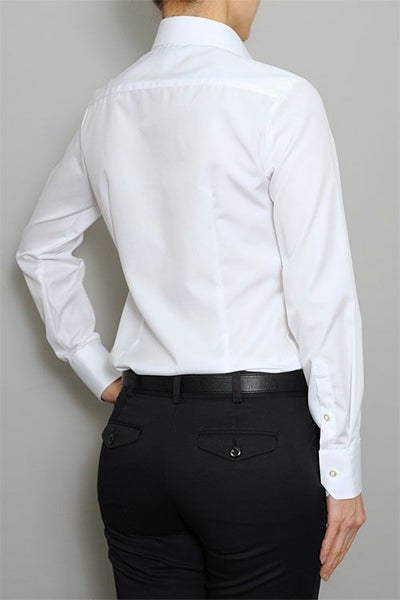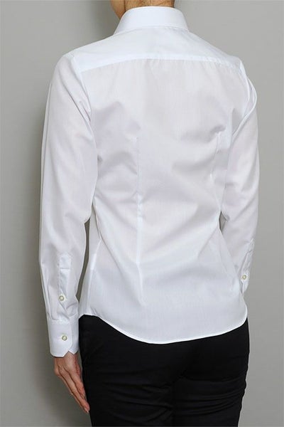 シンプル&ベーシックのスリムなスタイルに小ぶりな衿のワイドカラーレディースシャツ。