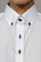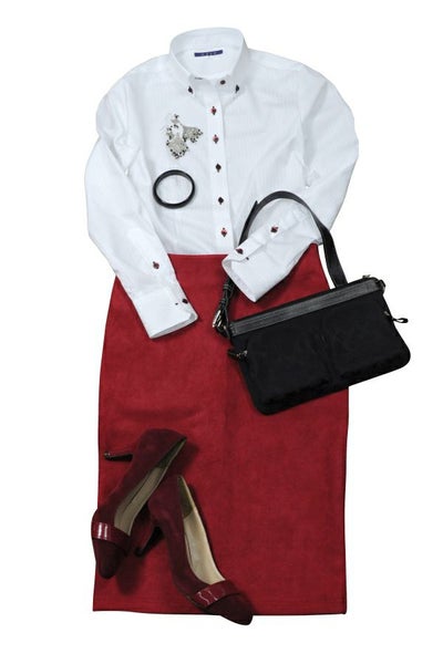 シンプルな白シャツに、ワインレッドのボタンがピリッとしたアクセント。