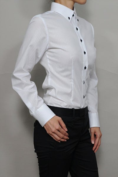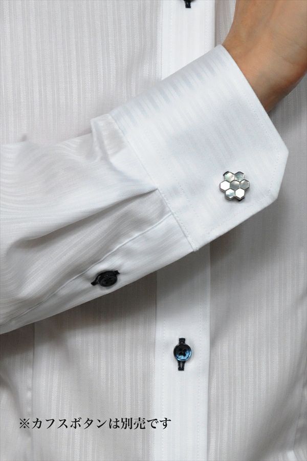 通常のボタン留プラス、カフスボタンも使えるコンバーチブルカフス。レディースシャツでも、袖元はすっきりしたまま、ダブルカフスのようにカフスボタンの上品なアクセントとオシャレを楽しむことが出来ます。