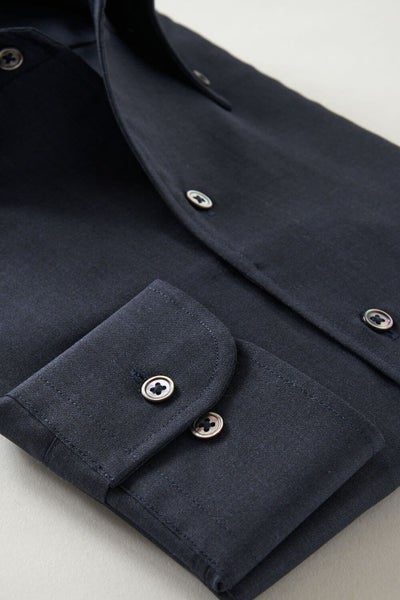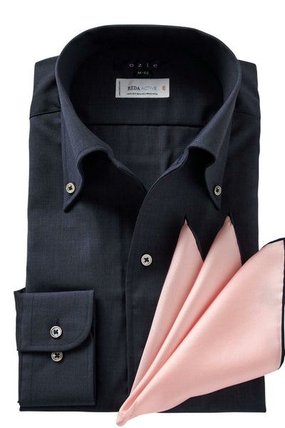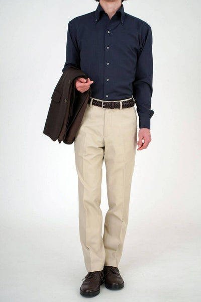 ネイビーのシャツをビジネスシーンで着用できる方は少ないかもしれませんが、アウターの色をさほど選ばないので広範囲に使えるのがネイビーシャツです。