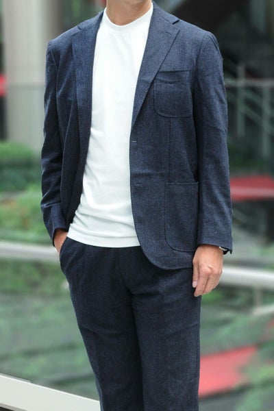 スーツ・ジャケットに合わせることを想定して、ルーズフィットではなく普通サイズにて生産しました。