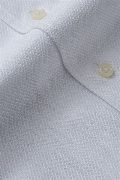 見た目はシャツ生地でありながら、ニット生地の鹿の子に近い涼しげな見栄え。実際メッシュ状に織り込まれた目の粗いからみ織りは、ニット生地よりいい意味でシャツ生地らしい張りがあってシャリ感が強く、汗をかいた際にべたっと肌に張り付きにくい肌離れのいい素材。