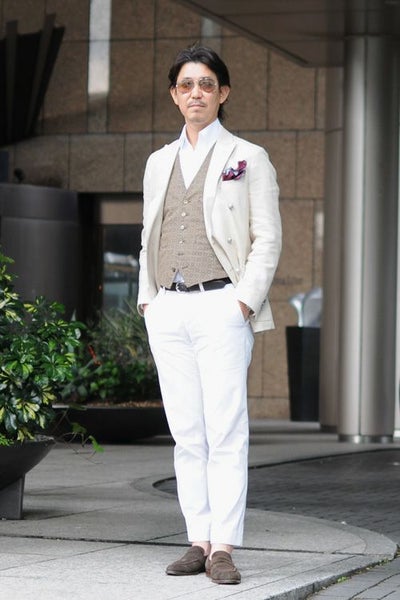 パーティーシーンでは、アクセントとして首周りにアスコットタイなどを巻くと、よりいっそうエレガンス度UPです。