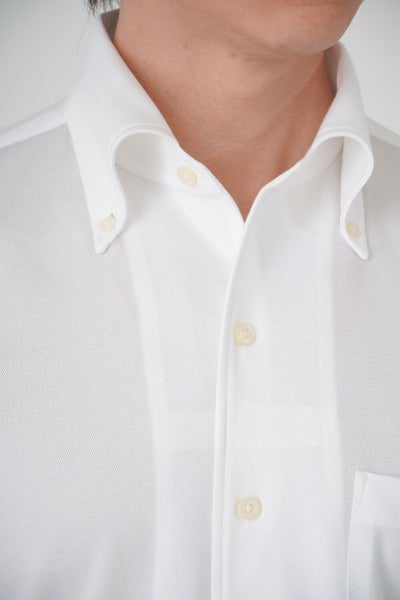 見た目はワイシャツの定番生地ピンポイントオックスフォードのようで、通気性抜群の“ハニカムメッシュ“