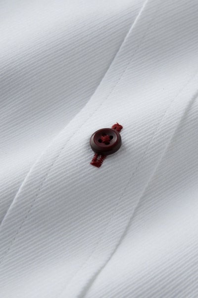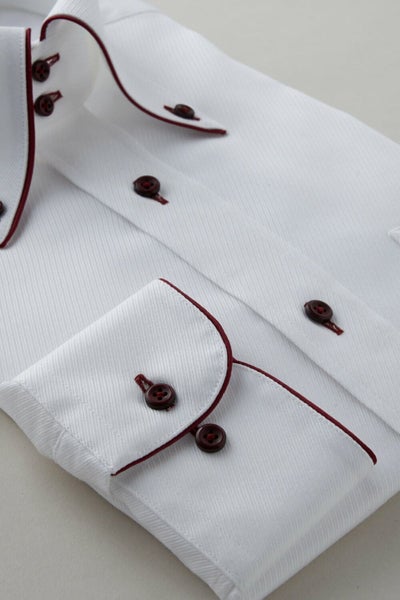このシャツは衿の一部とカフス部分に赤のサテンテープでパイピングを施しました。