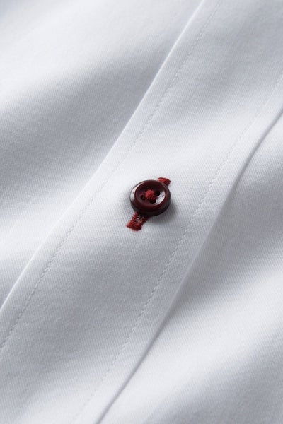 このシャツは衿の一部とカフス部分に赤のサテンテープでパイピングを施しました。