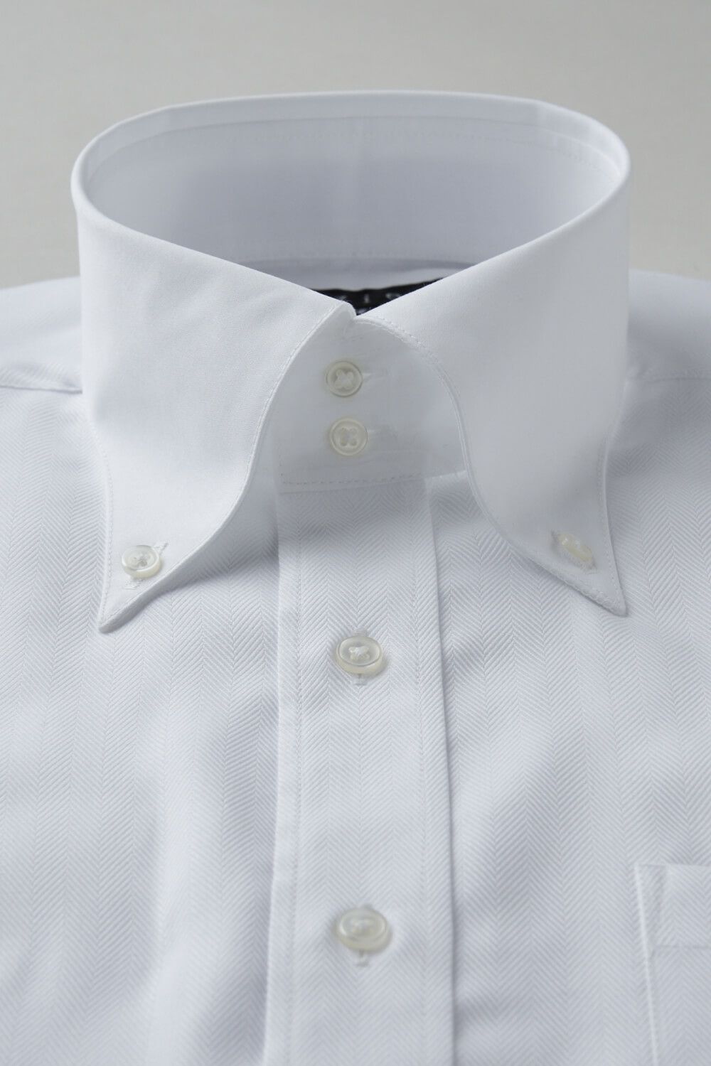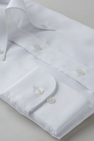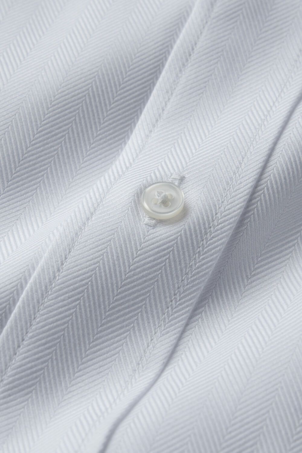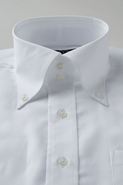 通常は身頃にカラー無地やカラーストライプ柄を使いますが、このシャツは身頃に衿とカフスに使用しているブロード生地と違う、ヘリンボーンの織柄が入った白無地生地を使用。
