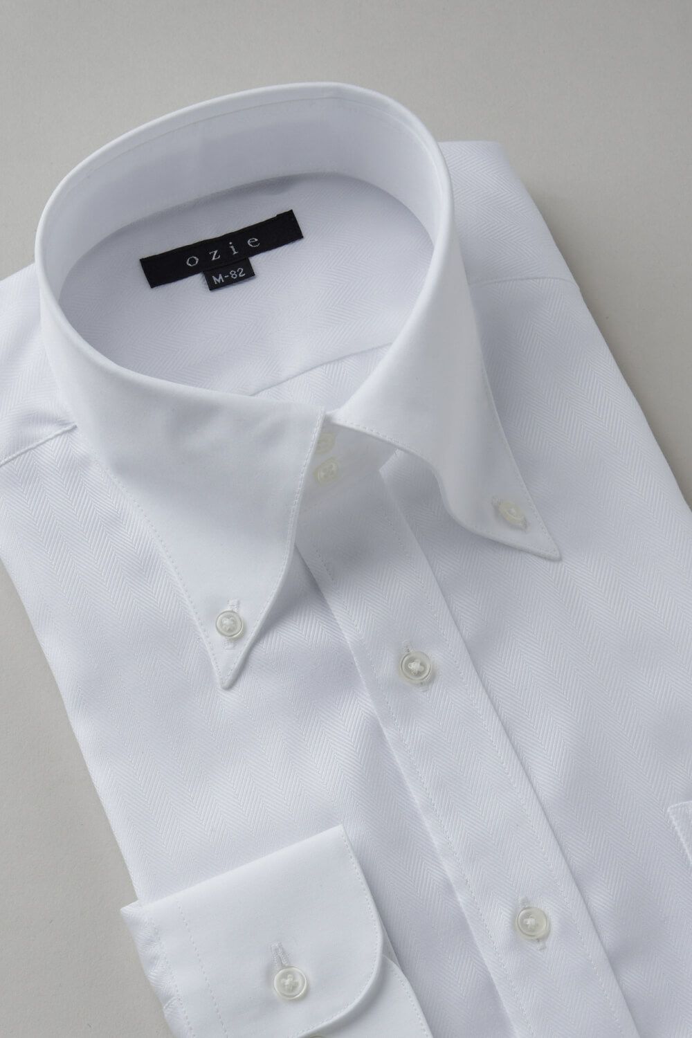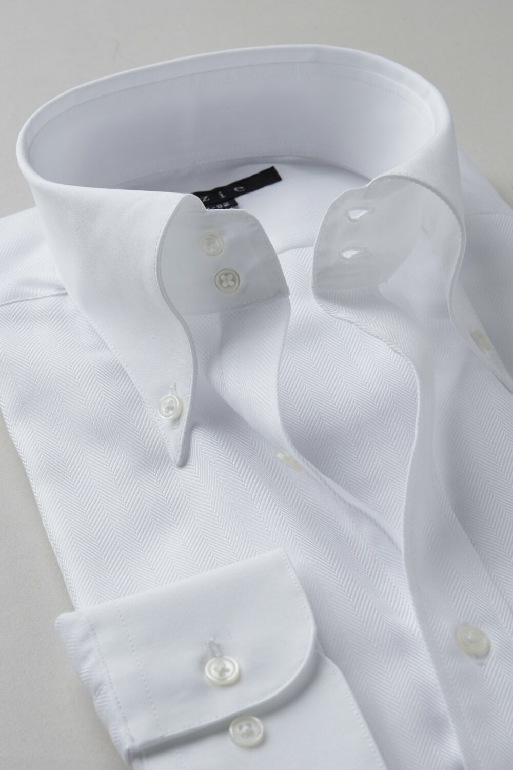 遠目からパッと見た目は普通の白無地シャツ、近づいてよく見るとクレリックという二面性をもった、小粋で珍しい白無地シャツとして生産しました。