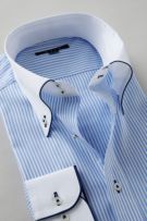 このシャツは白い衿に紺の生地を重ね合わせて作った2枚衿風に見えるよう衿の一部分と、カフス部分に紺のサテンテープでパイピングを施しました。
