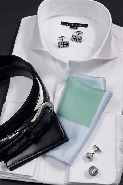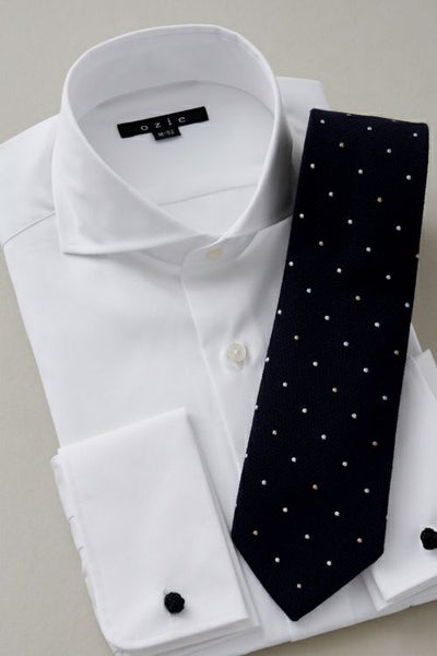 ozieではネクタイとの相性がいいホリゾンタルカラーをダブルカフス仕様にして生産。