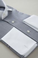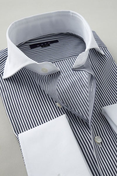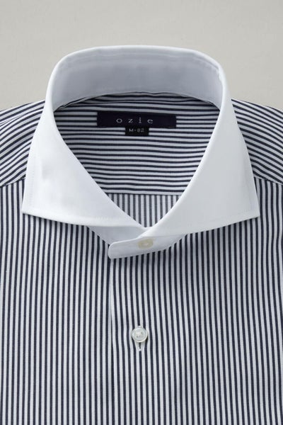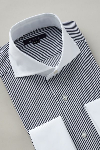 ozieではネクタイとの相性がいいホリゾンタルカラーをダブルカフス仕様にして生産。
