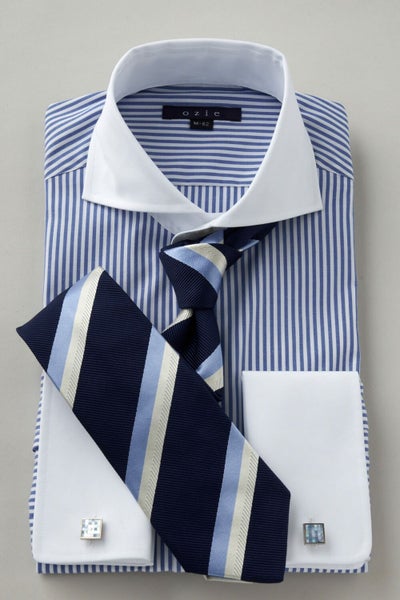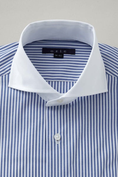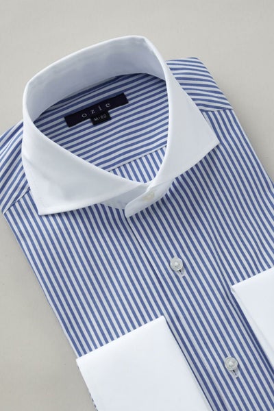 ozieではネクタイとの相性がいいホリゾンタルカラーをダブルカフス仕様にして生産。