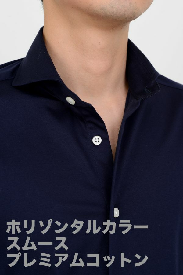 衿型は、衿の開き角度が大きく水平に近いホリゾンタルカラー(カッタウェイ)。