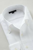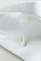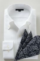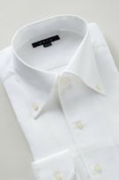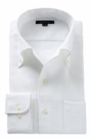 衿と前立ての裏部分がオープンカラーのように縫い目がなく、1枚の生地でつながって出来ているため、第一ボタンをはずして衿を開き気味にして着用すると衿から第一ボタンにかけてきれいなロールが出るようになっています。