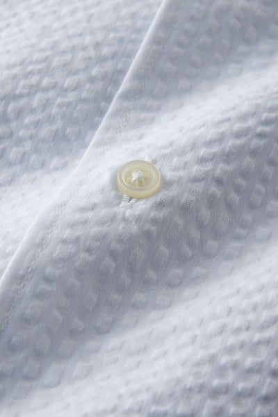 シアサッカーは凹凸のあるシボが入っていてそもそもしわ感があることから、家庭洗濯後洗いざらしでアイロンがけをせずにご着用いただけます。