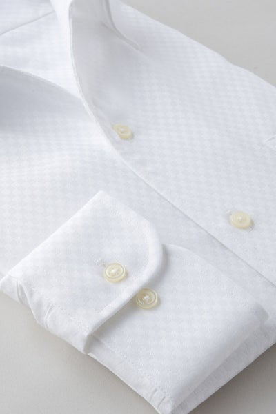 プレミアムコットン使用の綿100%に特殊な形態安定加工を施すことにより、ポリエステル混の形態安定シャツに近い防しわ性を実現しました