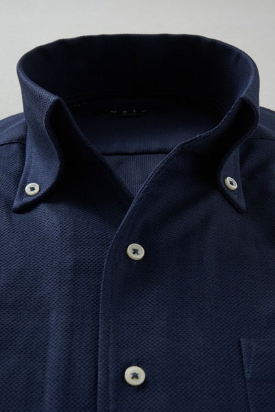 見た目はシャツ生地でありながら、ニット生地の鹿の子に近い涼しげな見栄え。