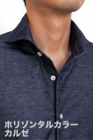 衿型は、衿の開き角度が大きく水平に近いホリゾンタルカラー(カッタウェイ)。
