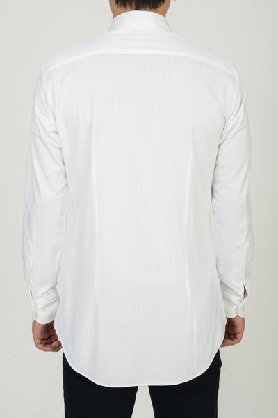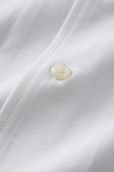 見た目はワイシャツの定番織柄である「ヘリンボーン」を再現しながら、ニット素材ならではのしなやかさと着心地の良さを備えています。
