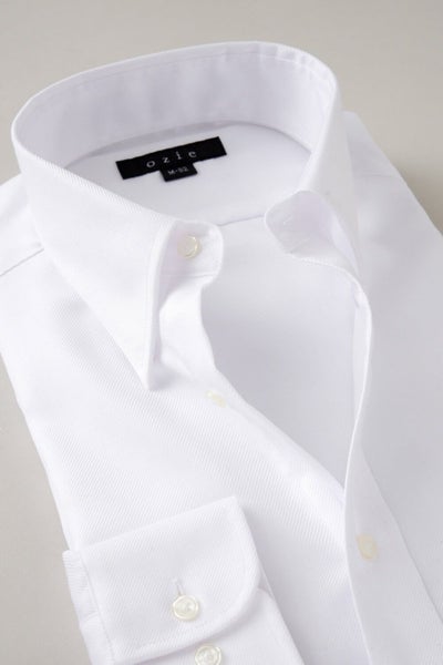 ネクタイを結んだ際のソフトな衿ロールがエレガントなスナップダウンシャツ。
