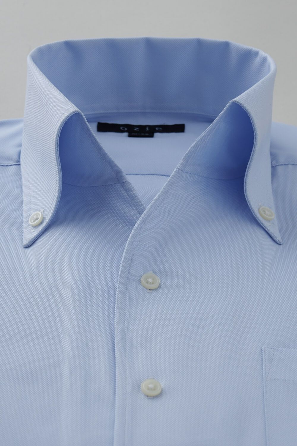このシャツは衿と前立ての裏部分がオープンカラーのように縫い目がなく、1枚の生地でつながって出来ている、衿開きのいいノーネクタイ専用シャツ。