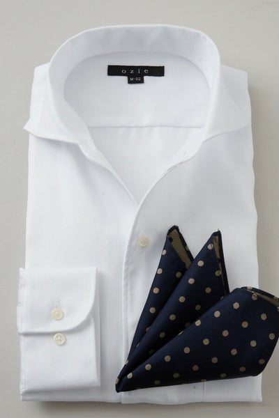 イタリアンカラーと広角なワイドカラーを掛け合わせたスタイリッシュなノーネクタイ専用の衿型です。