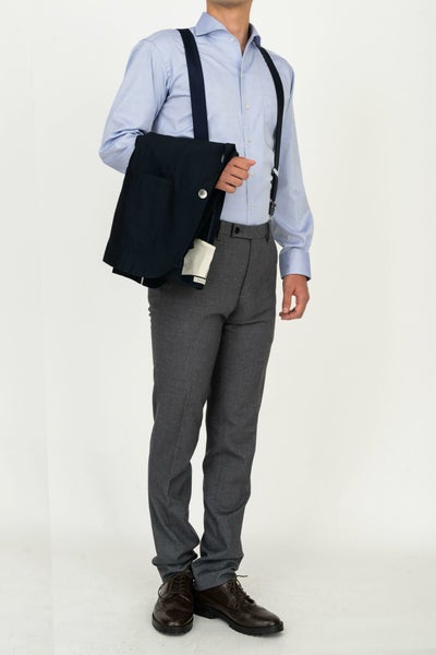 イタリアンカラーと広角なワイドカラーを掛け合わせたスタイリッシュなノーネクタイ専用の衿型です。