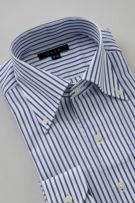 衿と前立ての裏部分がオープンカラーのように縫い目がなく、1枚の生地でつながって出来ているため、第一ボタンをはずして衿を開き気味にして着用すると衿から第一ボタンにかけてきれいなロールが出るようになっています。