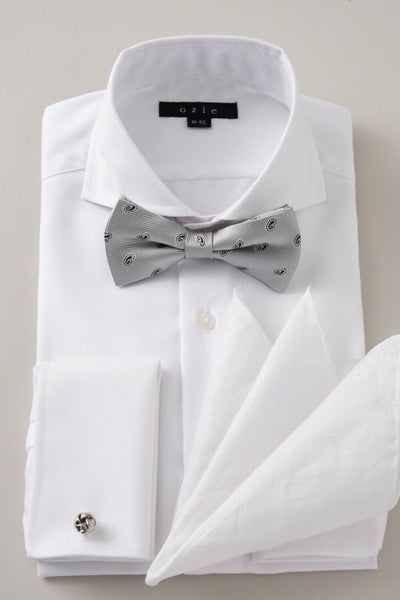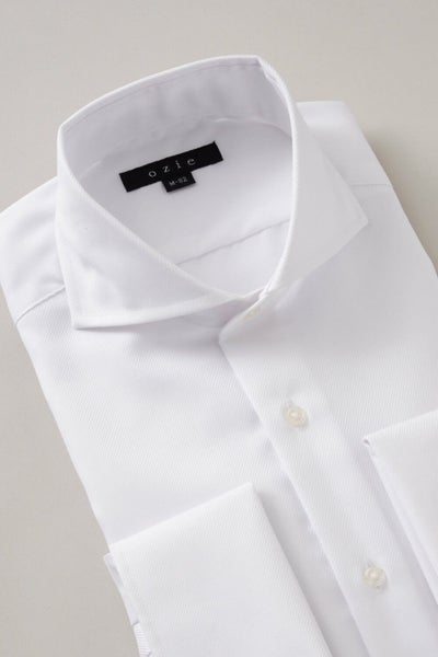 ozieではネクタイとの相性がいいホリゾンタルカラーをダブルカフス仕様にして生産。