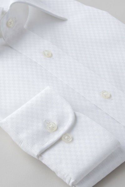 プレミアムコットン使用の綿100%に特殊な形態安定加工を施すことにより、ポリエステル混の形態安定シャツに近い防しわ性を実現しました