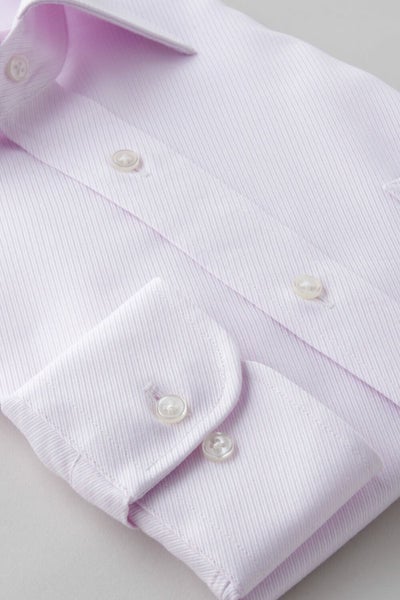 プレミアムコットン使用の綿100%に特殊な形態安定加工を施すことにより、ポリエステル混の形態安定シャツに近い防しわ性を実現しました