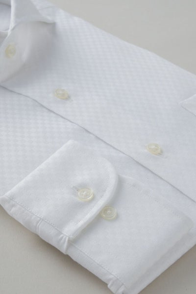 プレミアムコットン使用の綿100%に特殊な形態安定加工を施すことにより、ポリエステル混の形態安定シャツに近い防しわ性を実現しました